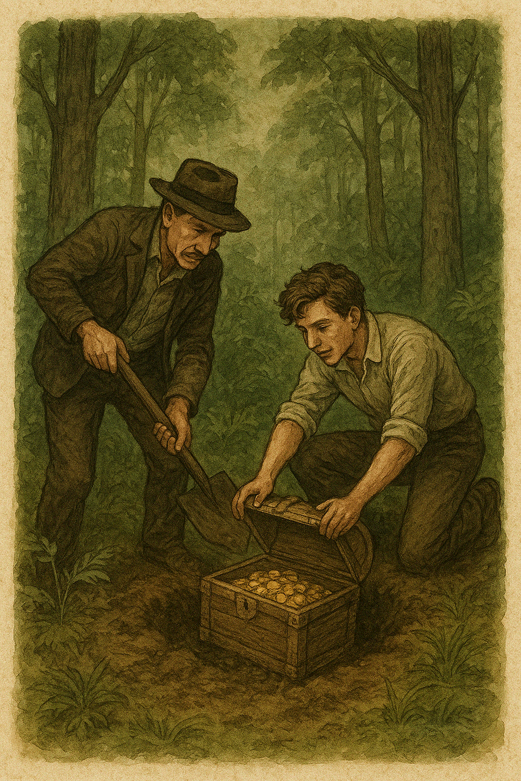 Двое английских путешественников – Эванс и Хукер проникают на тропический остров в поисках сокровищ, спрятанных китайским торговцем. После непродолжительных поисков они находят сундук с золотом, а вместе с богатством – труп видимо владельца сокровищ. Ослеплённые жадностью англичане в итоге погибают от отравленных шипов, так и не воспользовавшись найденными драгоценностями.