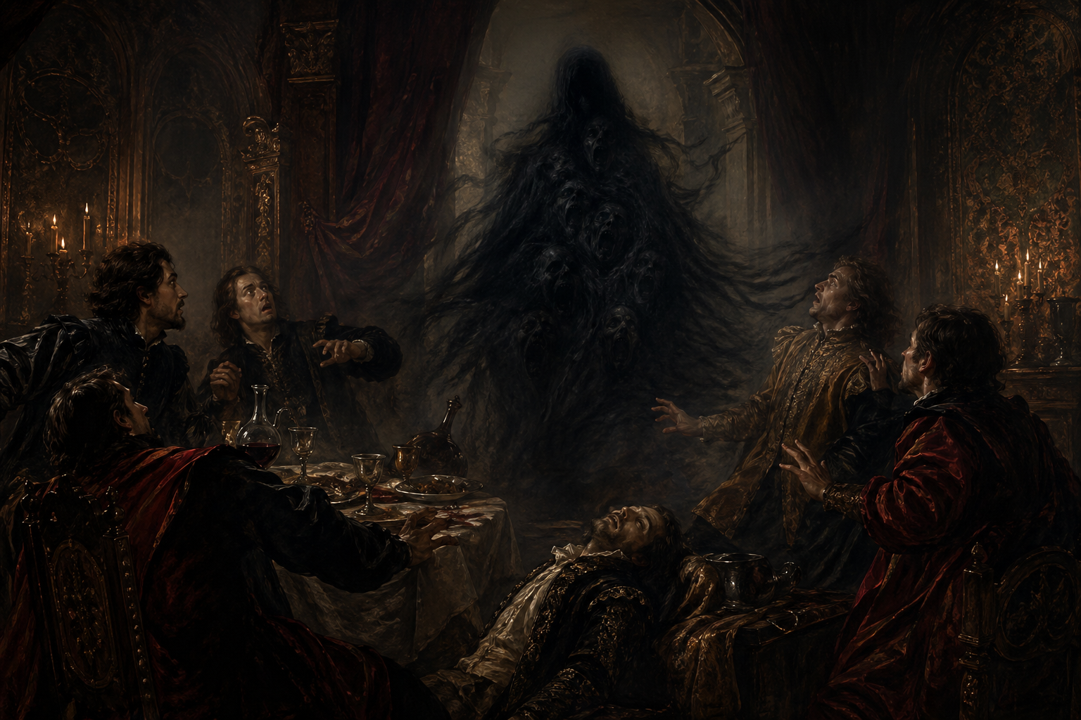 Главный герой, понимая, что вскоре умрёт, описывает жуткие события, происходящие во время страшной чумы, охватившей весь мир. В городе Птолемаиде он вместе с шестью друзьями запирается в роскошном зале, пытаясь забыться в вине и песнях, несмотря на происходящее вокруг и даже нахождение в помещении трупа их друга Зоила. Внезапно из тёмных завес появляется бесформенная тень, которая отвечает на вопрос героя: она - воплощение смерти и говорит голосами множества умерших, повергая всех присутствующих в дикий ужас.