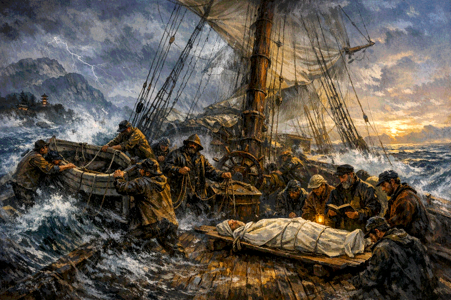 Команда шхуны «Софи Сазерленд» у берегов Японии выходит в море на охоту за котиками. Погода сначала кажется спокойной, но вскоре усиливается ветер, падает барометр, и капитан приказывает возвращаться. Начинается сильный шторм: шлюпки едва удаётся поднять на борт, судно тяжело борется с волнами и ветром всю ночь. Матросы работают на износ, уменьшая паруса и удерживая шхуну от гибели. К утру буря начинает стихать, и корабль возвращается к месту промысла. Во время шторма от чахотки умирает тяжело больной матрос, и его готовят к морскому погребению.