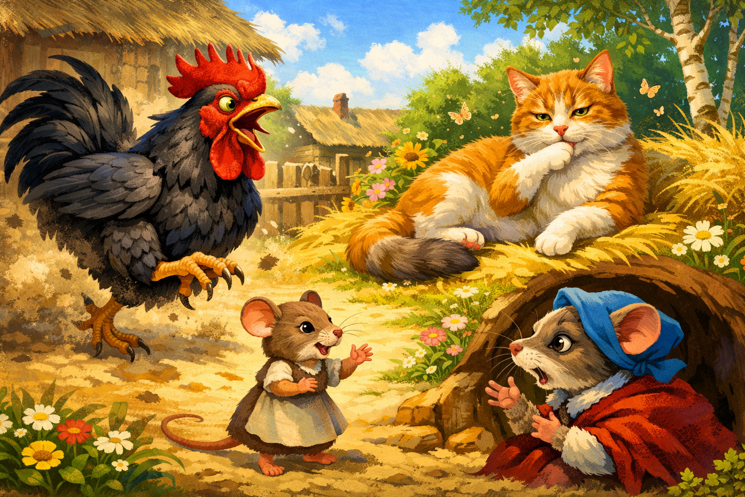 Мышка выходит погулять и, вернувшись, рассказывает матери, что видела двух зверей: одного – очень страшного и свирепого, другого – довольно милого и доброго. «Страшный», по её словам, кричал, топал ногами, выглядел грозно и пугающе. «Добрый» же лежал на солнышке, был гладкий, чистенький, спокойный и даже будто бы ласковый. Мать спокойно объясняет: страшный зверь - всего лишь петух, который никому не причиняет зла. А вот «добрый» и тихий – кот, главная опасность для мышей.