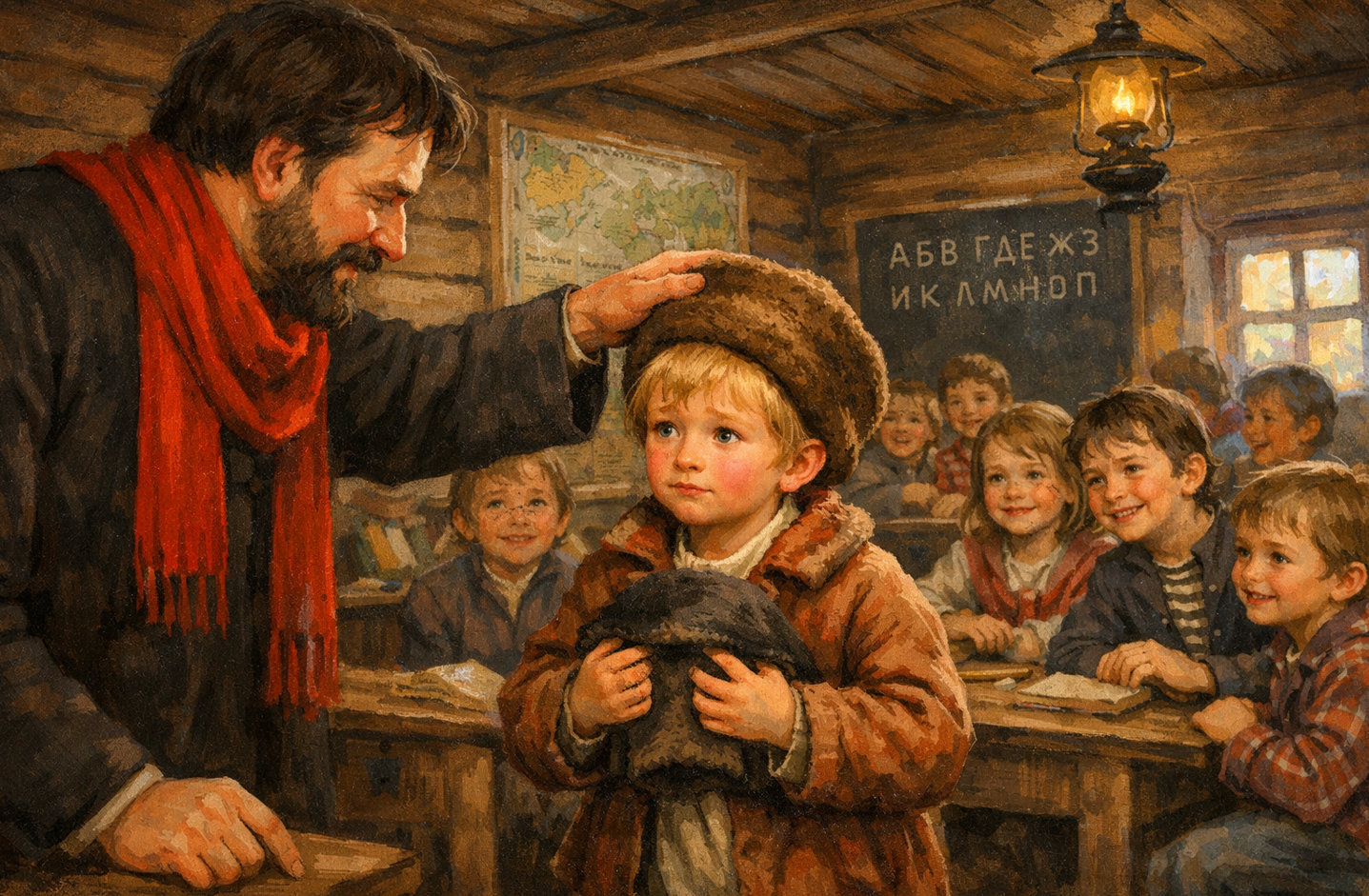 Рассказ о маленьком мальчике, который так сильно хочет учиться, что несмотря на запрет матери, тайком пробирается в учебный класс школы.
